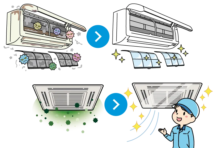 ①熱交換器のカビ・埃の詰りによる熱交換効率の低下→たとえば26℃設定の空調を行う場合余分にエネルギー(電気量)が必要になると言う事です。つまり掃除は…省エネに貢献します!